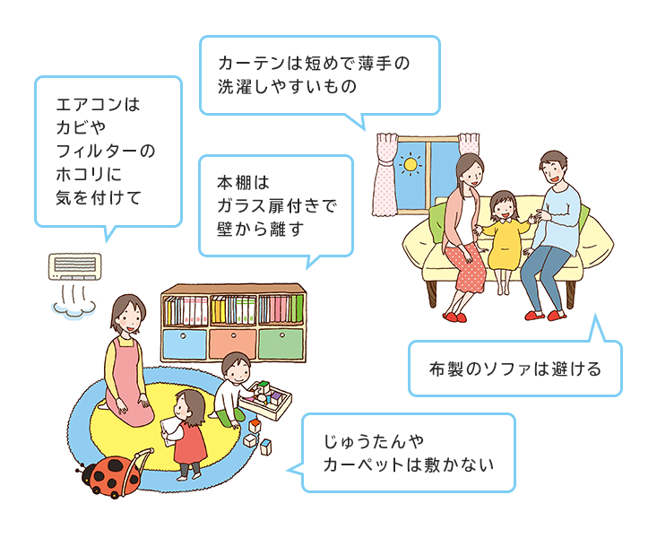 こまめに掃除機をかけて週に1回は布団をお日様に干すなど、できるだけ生活環境からこれらを排除します。犬や猫、小鳥など毛のあるペットは飼育しない方が望ましいです。すでに飼育している場合には主治医の先生と相談しましょう。